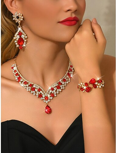 Conjunto feminino de colar, brincos e pulseira com cristais vermelhos, joias marcantes com strass dourados, estilo elegante e glamouroso para festas. &eventos noturnos