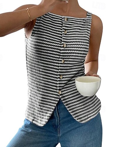 Mulheres Camiseta Botões Listrado Casual Sem Manga Decote Quadrado Tops regulares Diário Para Noite Final de semana Preto Vinho Verde Damasco Verão Primavera