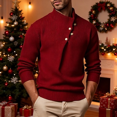 Homens Suéter de Natal camisolas de natal Pulôver suéter Suéter de malha Estriado Tricotar Tops regulares Botões Tricotado Tecido Colarinho Chinês Moda Básico Férias Roupa Diária Roupa Outono Inverno