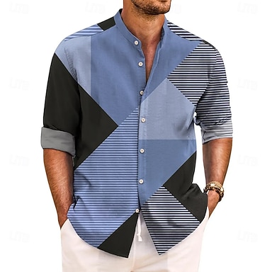 Homens Geométrica Bloco de cor Retalhos Camisa Social Camisa de gola alta Manga Longa Moda Casual Dia a Dia Feriado Primavera Outono Colarinho Mandarim Faixa Impressão 3D Camisas de botões Azul Rosa