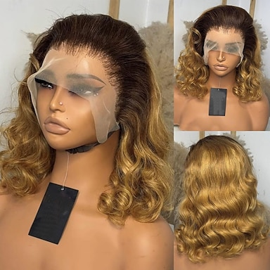 Cabelo virgem não processado 13x4 Lace Front Peruca Bob curto Cabelo Brasileiro Ondulado Multi Cores Peruca 130% 150% Densidade do Cabelo Cabelo com Luzes / Reflexos Riscas Naturais Sem cola Para