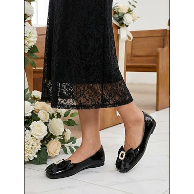 Sapatilhas femininas pretas de verniz com pérolas e laço - elegantes sapatilhas para a mãe da noiva em casamentos na igreja.