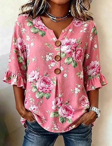 Mulheres Camisa Social camisa Boho Blusa Imprimir Floral Gráfico Vintage Diário à moda Manga Longa Decote V Tops longos Diário Feriado Azul Rosa Verão Primavera
