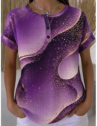 Blusas Tricot Texturizadas em Waffle Femininas T Shirt com Estampa Gráfica Geométrica Mármore Vintage Estilosa Clássica de Manga Curta Gola Careca Redonda Henley Tops Regulares para Esportes Diários