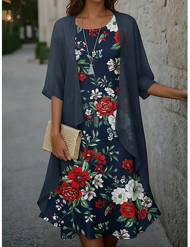 Mulheres Vestido midi Vestido casual Conjunto de vestido Elegante Moda Moderno Ao ar livre Férias Para Noite Normal Floral Manga 3/4 Gola Redonda Azul Marinha Verão Primavera Outono