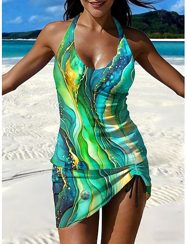 Mulheres Roupa de Banho Tankini Saia roupa de banho Elegante Férias Gráfico Geométrica Halter pescoço Sem Manga Fatos de banho