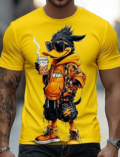 Camiseta masculina estilosa com estampa de pato preto descolado usando óculos escuros e tomando chá de bolhas. Estilo streetwear urbano hip hop, manga curta, gola redonda, divertida, ideal para