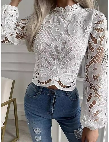 Mulheres Blusa Tops de renda Renda Tecido à moda Manga Longa Gola Alta Tops regulares Diário Feriado Para Noite Branco Primavera Outono