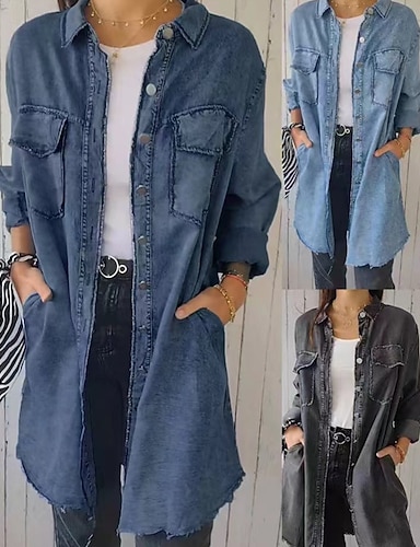 Mulheres Blusa Bolsos Botões Tecido Vintage Diário à moda Manga Longa Colarinho de Camisa Tops longos Diário Feriado Para Noite Azul Preto Cinzento Azul Claro Verão Primavera Outono