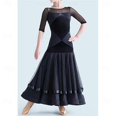 Vestido de dança de salão feminino com meia manga de malha valsa tango latino prática competição performance elegante saia preta em camadas de chiffon