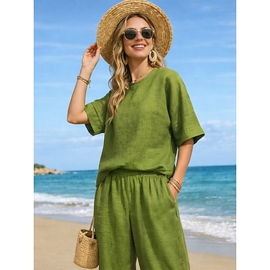 Conjuntos de linho de algodão feminino, conjuntos de duas peças, cor pura, quente, casual, conforto, casa, diário, primavera, outono
