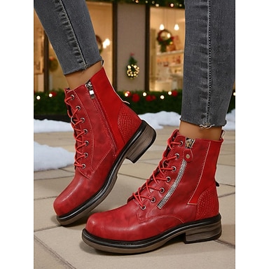 Botas de combate femininas vermelhas de Natal - botas de amarrar da moda para mulheres - perfeitas para a véspera de Natal, moda de inverno e chique casual