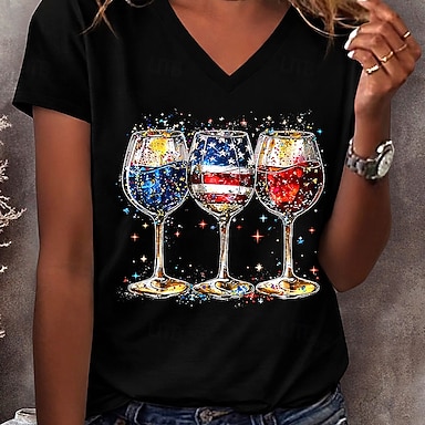 Dia da Independência Americana Mulheres Camiseta Imprimir Gráfico Letra Bandeira americana Vintage à moda Clássico Manga Curta Gola Redonda Tops regulares Diário Preto Branco Verão Primavera