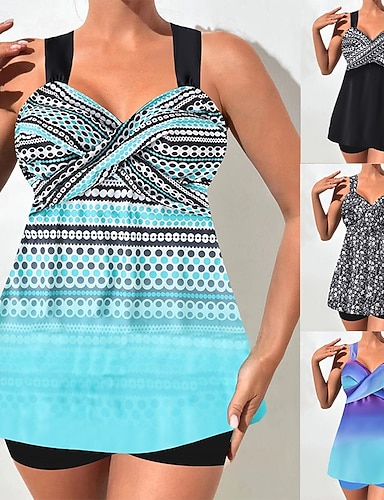 Maiô Tankini Feminino 2 Peças Estilo Cheeky Controle de Barriga Cintura Alta Slim Costas Descobertas Roupas de Praia de Férias Gráfico Geométrico Decote em V Sem Mangas