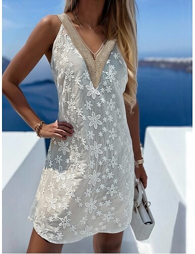 Mulheres Minivestido Vestido de renda Vestido branco Elegante Moda Moderno Ao ar livre Férias Para Noite Normal Floral Sem Manga Decote V Branco Verão Primavera