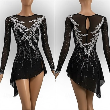 Vestidos para Patinação Artística Para Meninas Patinação no Gelo Vestidos Preto Patchwork Barra Assimétrica Com Stretch Treino Competição Roupa para Patinação Clássico Cristal / Strass Manga Longa