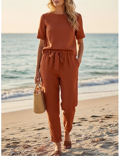 Mulheres Conjuntos de linho de algodão Conjuntos de duas peças Conjuntos de calças Manga Curta Decote Redondo Tecido Moda Roupa de rua Casual Diário Ao ar livre Verde Tropa Azul Marinha Marron Verão