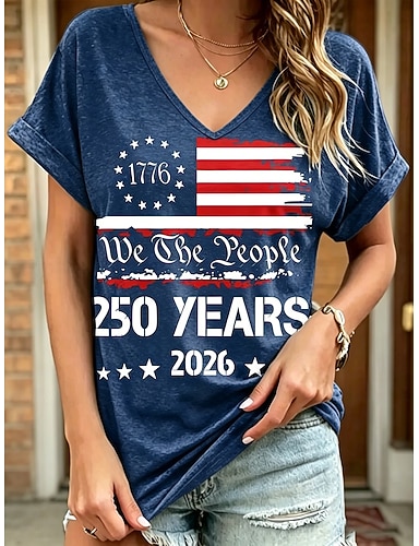 Dia da Independência Americana Mulheres Camiseta Imprimir Gráfico Bandeira americana Vintage à moda Clássico Manga Curta Decote V Tops regulares Casual Diário Final de semana Azul Preto Vermelho