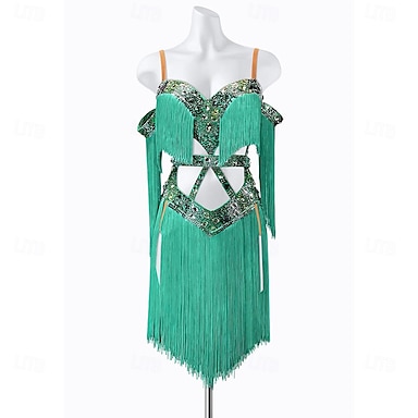 Vestido de dança latina feminino verde turquesa com franjas de lantejoulas - modelo assimétrico com recortes nos ombros, ideal para apresentações de salão.