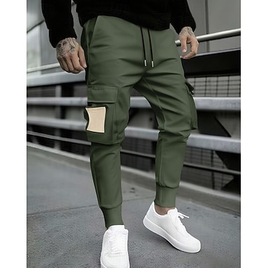 Homens Calças Cargo Corredores Calças Com Cordão Cintura elástica Bolso multi Côr Sólida A Prova de Vento Conforto Diário Ao ar livre Feriado Roupa de rua à moda Preto Verde Tropa