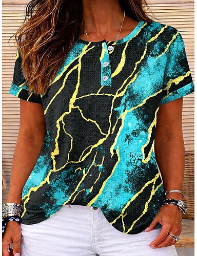 Blusas Tricot Texturizadas em Waffle Femininas T Shirt com Estampa Gráfica Geométrica Mármore Vintage Estilosa Clássica de Manga Curta Gola Careca Redonda Henley Tops Regulares para Esportes Diários