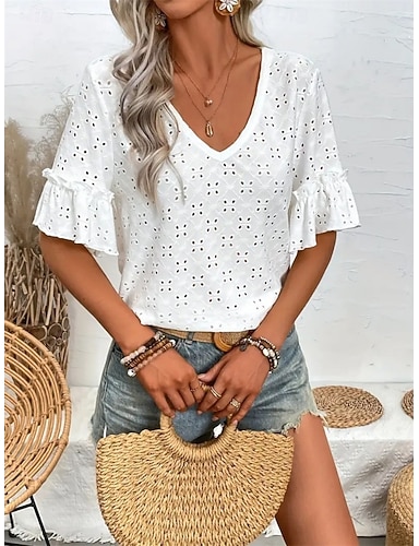 Mulheres Camisa Social Blusa Topo de ilhó Camisa com babados Vazado Tecido à moda Clássico Moderno Meia Manga Decote V Tops regulares Diário Feriado Para Noite Branco Verão Primavera