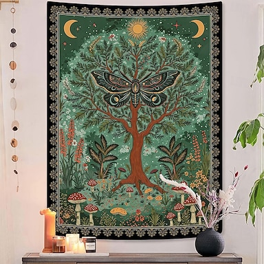 Tapeçaria vintage com mariposa e árvore da vida, em formato de cogumelo, para pendurar na parede, em tons de verde floresta, arte mística e celestial, ideal para decoração de quarto, sala de estar e
