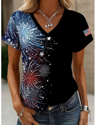 Dia da Independência Americana Mulheres Camiseta Bloco de cor Imprimir Gráfico Bandeira Bandeira americana Vintage à moda Clássico Manga Curta Decote V Tops regulares Diário Preto Azul Marinha