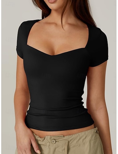 Mulheres Camiseta T-shirt Tecido Moda à moda Clássico Manga Curta Decote V Tops regulares Diário Para Noite Final de semana Preto Rosa Verde Cáqui Bege Verão Primavera