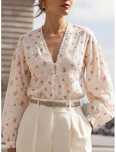 Mulheres Blusa Tops de renda Blusas de manga comprida Guarnição do laço Floral à moda Clássico Moderno Manga Longa Decote V Tops regulares Diário Feriado Para Noite Rosa Verão Primavera