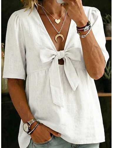 Mulheres Blusa Linho de algodão sintético Laço Côr Sólida Diário à moda Básico Meia Manga Decote V Tops regulares Diário Azul Branco Amarelo Rosa Vermelho Verão Primavera Outono