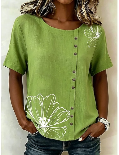 Mulheres Blusa Botões Imprimir Floral Gráfico Vintage Tropical à moda Manga Curta Gola Redonda Tops regulares Casual Feriado Azul Rosa Roxo Verde Verão Primavera