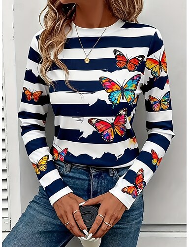 Mulheres Camiseta Imprimir Gráfico Borboleta Listrado Vintage à moda Moderno Manga Longa Gola Redonda Tops regulares Diário Final de semana Azul Amarelo Vermelho Roxo Outono Inverno
