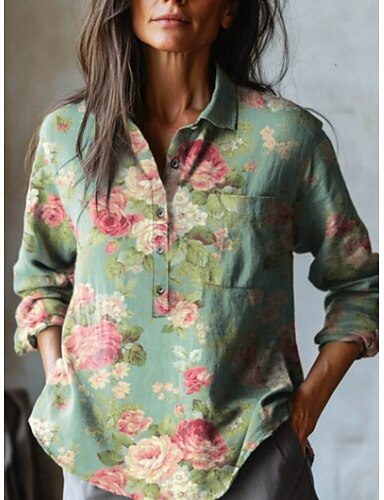 Mulheres Camisas de algodão e linho Linho de algodão sintético Botões Imprimir Folha Vintage à moda Básico Manga Longa Gola Redonda Tops regulares Diário Azul Rosa Verão Primavera Outono