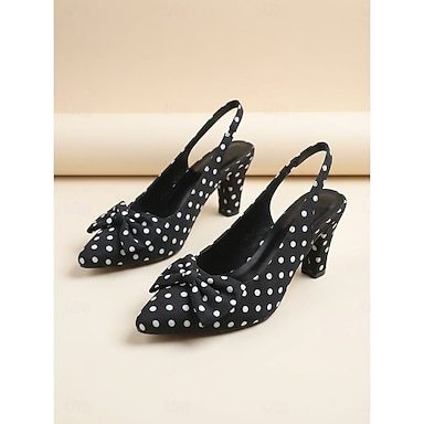 Sapatos de salto alto femininos retrô dos anos 50 com estampa de bolinhas - pretos &Sapatos de salto alto brancos com bico fino e detalhe de laço, perfeitos para festas vintage e eventos rockabilly.