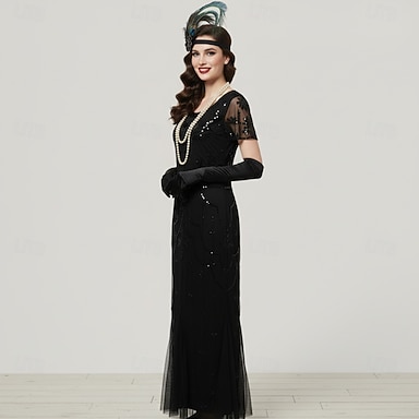 Loucos anos 20 Anos 20 Até o Tornozelo Vestidos Vestido de Festa Roupa Mangas curtas O Grande Gatsby charleston Convidado do casamento Pena Decote V Fantasia Mulheres Ano Novo Baile de Máscaras Baile
