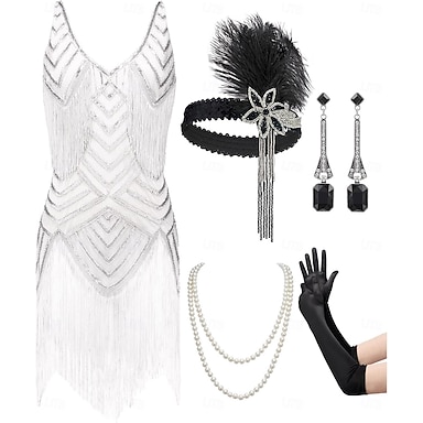 Vintage Loucos anos 20 Anos 20 Até os Joelhos Vestido melindroso Luvas Peça para Cabeça Sem Mangas O Grande Gatsby charleston Paetês Franjas Fantasia Mulheres Dia Das Bruxas Carnaval Coquetel Adulto
