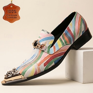 Mocassins masculinos estampados multicoloridos, de bico fino e com biqueira metálica, ideais para casamentos, banquetes, festas, bailes de formatura, desfiles de moda, baladas e eventos noturnos de luxo.