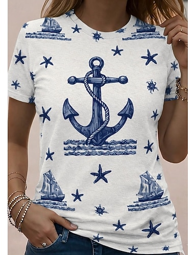 Camiseta feminina com estampa de âncora, efeito degradê, estampa oceânica, estilo vintage, clássica, manga curta, gola redonda, comprimento longo, azul e branca, ideal para o dia a dia, nas cores da