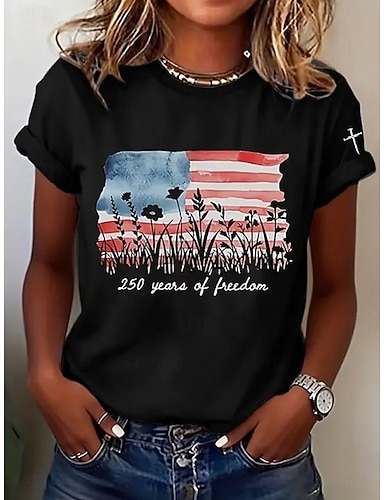 Dia da Independência Americana Mulheres Camiseta Imprimir Gráfico Letra Bandeira americana Vintage à moda Clássico Manga Curta Gola Redonda Tops regulares Diário Preto Branco Verão Primavera