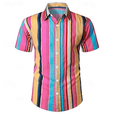Homens Camisa Social camisa de verão Camisa casual camisa de praia camisa de botão Rosa Vermelho Azul Café Manga Curta Riscas Lapela Férias Havaiana Roupa Poliéster Moda Casual Confortável