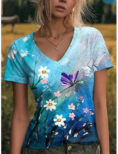 Mulheres Camiseta Imprimir Floral Gráfico Vintage à moda Clássico Manga Curta Decote V Tops regulares Casual Diário Para Noite Azul Verde Verão Primavera