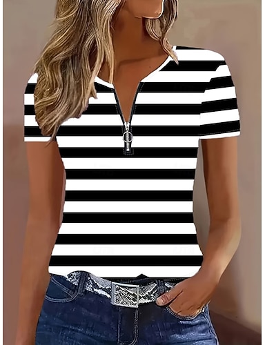 Mulheres Camiseta Quarter Zip Gráfico Listrado Tropical Havaiana à moda Manga Curta Gola Redonda Tops regulares casamento na praia Diário Esportes Preto Verão Primavera
