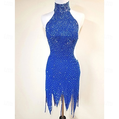 Vestido de dança latina feminino, azul royal, com strass, recorte, traje de competição para cha cha, samba jive