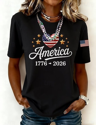 Dia da Independência Americana Mulheres Camiseta Imprimir Gráfico Bandeira americana Vintage à moda Clássico Manga Curta Gola Redonda Tops regulares Diário Final de semana Preto Verão Primavera