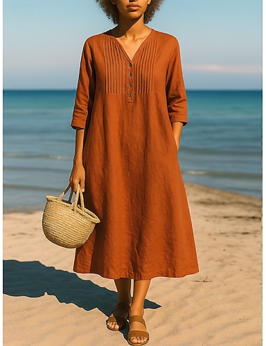 Mulheres Vestido midi Linho de algodão sintético Vestido A Line Vestido de verão Casual Diário Ajuste Largo Tecido Meia Manga Pescoço Entalhado Azul marinho Rosa Marron Verde Verão Primavera