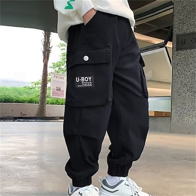 Infantil Para Meninos Calças Calças Cargo Calças Patchwork Bolsos Côr Sólida Respirável Macia Comfort Calças Ao ar livre Diário Básico Preto Cáqui Cintura média