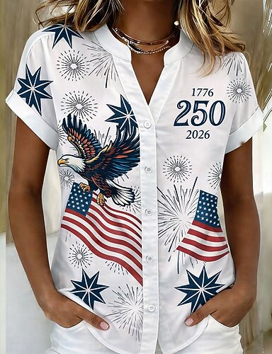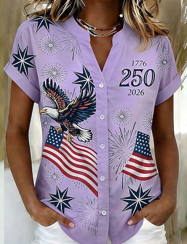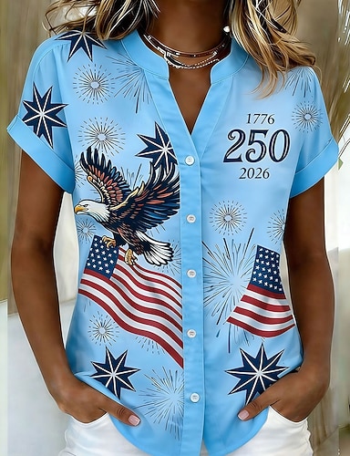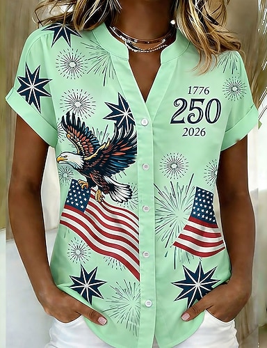 Dia da Independência Americana Mulheres Blusa Botões Imprimir Gráfico Geométrica Estrela Vintage à moda Casual Manga Curta Decote V Tops regulares Diário Branco Verão Primavera