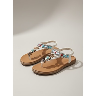 Sandálias pretas femininas estilo boêmio - sandálias étnicas com tira em T e aplicações de miçangas, com confortável tira elástica no calcanhar, ideais para férias ao ar livre e viagens de verão.