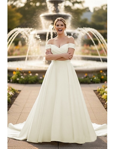 Vestidos de noiva Linha A Ombro a Ombro Sem Manga Cauda Escova Cetim Vestidos de noiva Com Franzido Cor Única